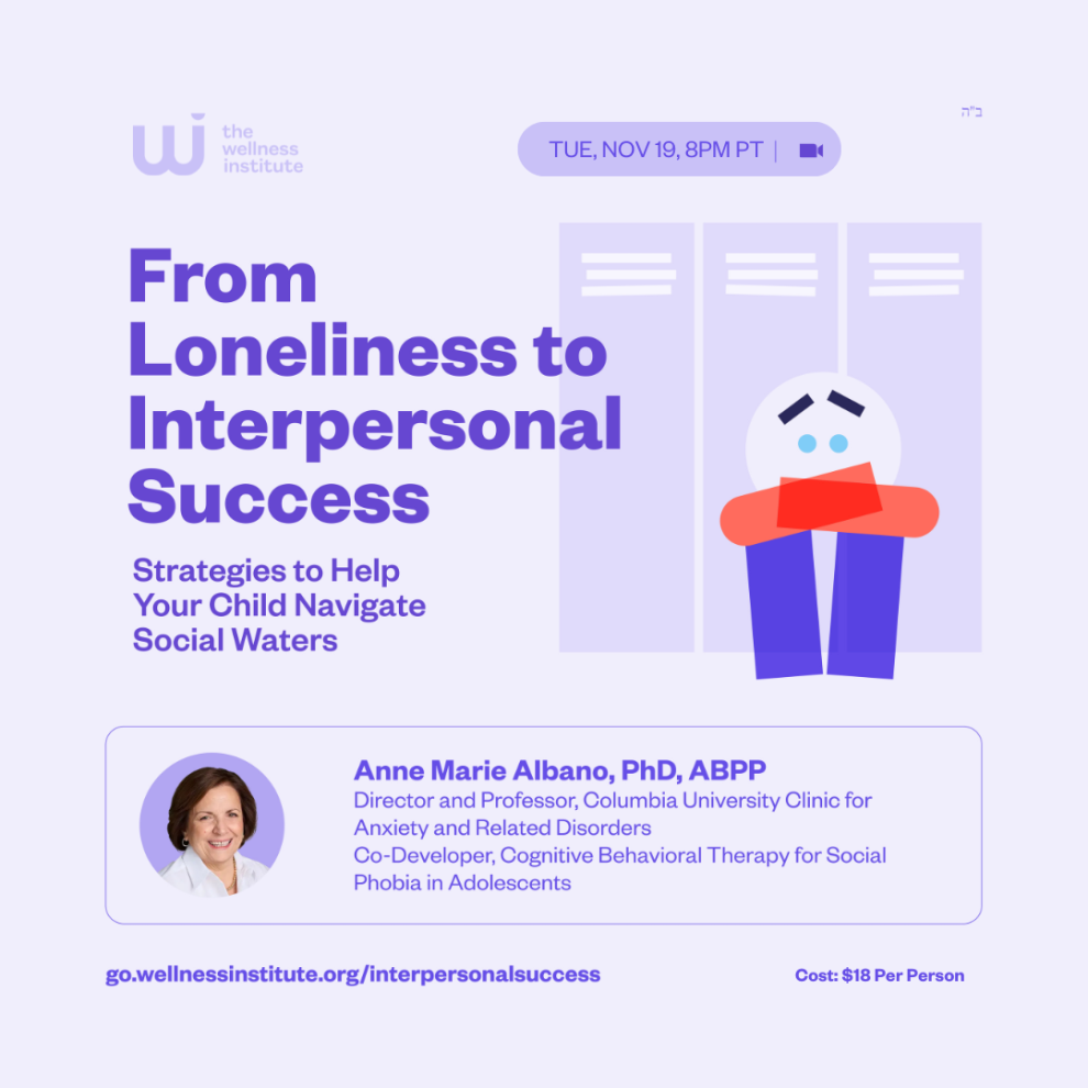 Join us with Dr. Anne Marie Albano for From Loneliness To Interpersonal Success on Tuesday, November 19, from 8:00-9:30 PM EST Dr. Anne Marie Albano, a leading expert in child anxiety and mood disorders, will share her expertise on how to recognize and address social anxiety in children. You will gain valuable insights and practical strategies to support your child.
