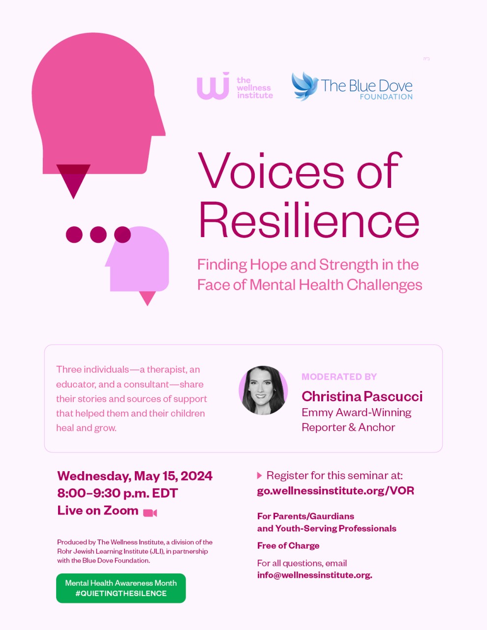 Join The Wellness Institute and the Blue Dove Foundation on May 15, 2024 8:00 p.m. EDT/5:00 p.m. PDT to hear the moving stories of an educator, therapist and Jewish proffesional, whose families faced mental health and/or substance use challenges with strength and resilience.